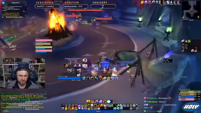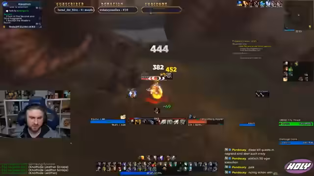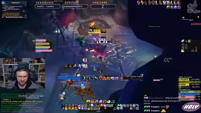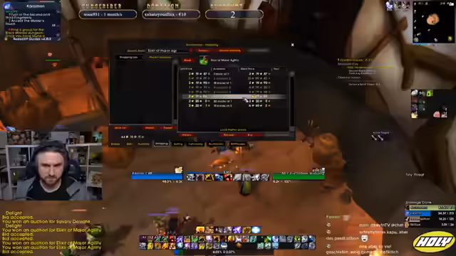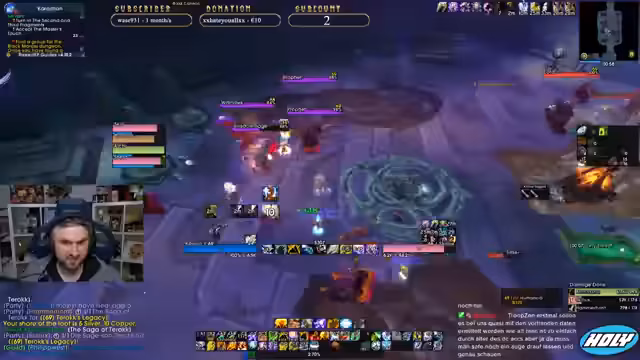 01:53:31Der Streamer und seine Gruppe starten den Dungeon 'Schwarzer Morast', wobei die technische Leistung des Servers eine Diskussion über Lags und die Bedeutung von Addons für das Verwalten mehrerer Warteschlangen auslöst. Während des Dungeonlaufs wird die Beschaffung von Auktionshaus-Gegenständen und Marken zur Verbesserung der Ausrüstung thematisiert. Die Kosten für Skillpunkte im Beruf des Verzauberers und das Problem fehlenden Golds führen zu einem kontroversen Dialog über die Notwendigkeit des Grindens.