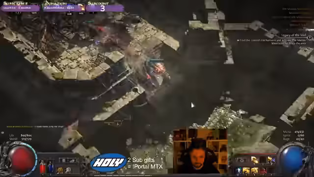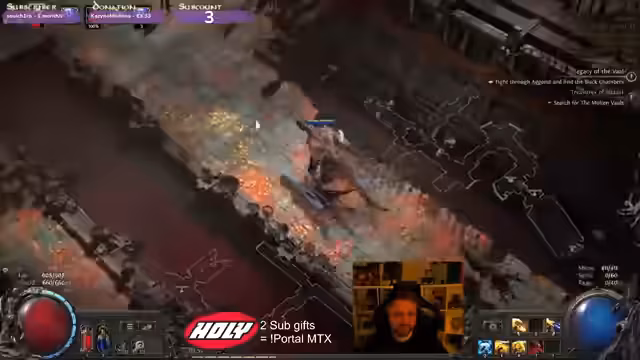 03:03:24Der Fokus liegt auf der League-Mechanik Dungeon Builder mit Diskussion über die kürzlichen Buffs. Bei Räumen der Stufe T2 wird Loot wie Exalted Orbs und Chaos Orbs gefarmt, wobei die Effizienz kritisiert wird. Probleme mit Resistenzen werden durch Rüstungs-Upgrades teilweise gelöst, während Energy-Shield-Werte optimiert werden. Nebenbei plant der Spieler die Verwendung von Jawbone-Rüstungen und erläutert die Grenzen von T3-Räumen aufgrund früherer Tode.
