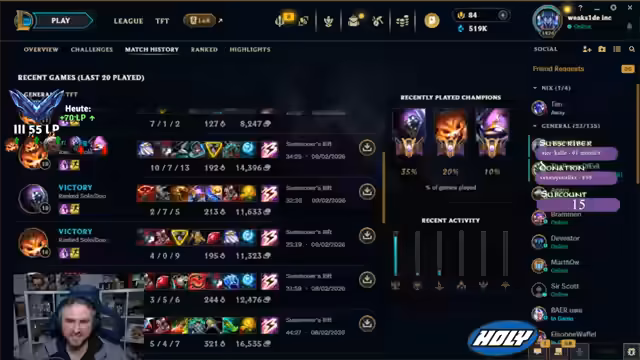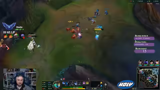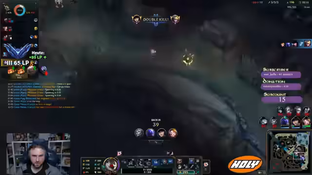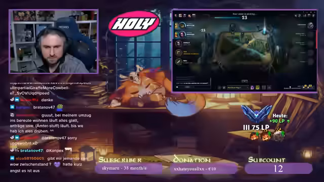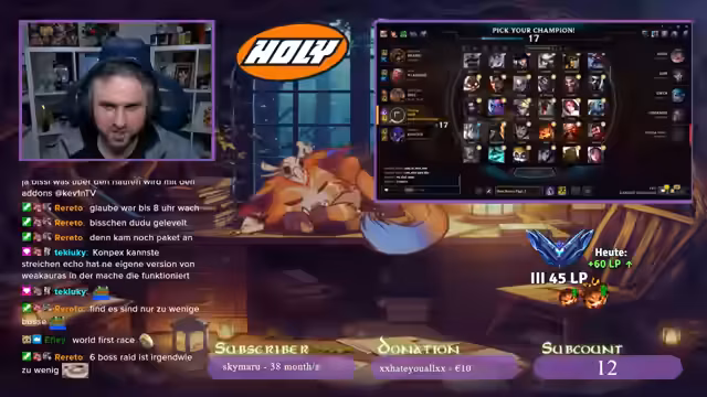 00:00:32Der Stream beginnt mit dem Willkommen der Zuschauer und einem lockeren Smalltalk. Der Streamer tauscht sich über gesundheitliche Themen wie ein verstauchtes Handgelenk aus und geht auf aktuelle League of Legends-Themen ein, wie beispielsweise die 'Roll Fairness' und Champion-Builds. Viele Zuschauer begrüßen den Streamer per Namen, was eine enges Community-Verhältnis andeutet. Ein technischer Ruckler wird kurz angesprochen und schnell wieder vergessen.