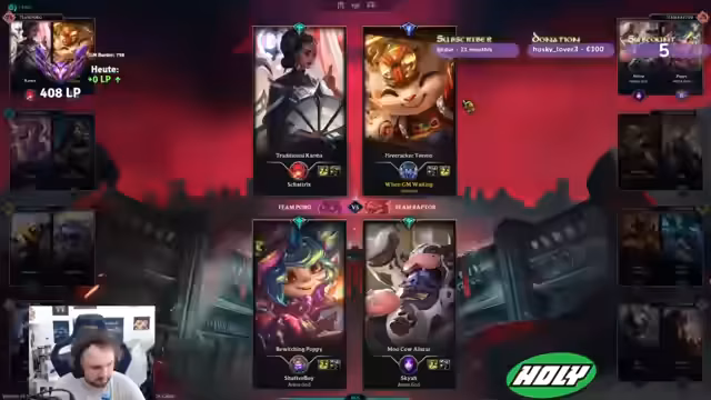 02:15:19Nach dem Ende einer Runde beginnt die Vorbereitung für die nächste. Der Streamer öffnet das Champ-Select, bei dem er versehentlich Atrox bant und dies sofort korrigiert. Die ausgewählten Champions wie Graves, Katarina und Lux werden diskutiert. Gleichzeitig finden neue Zuschauer den Weg zum Stream, wie 'Sir Minion' und 'Andy', und es wird offen, wer mit spielt. Der Streamer lädt auch gezielt bekannte Namen wie 'Cori' oder 'Troopson' ein.