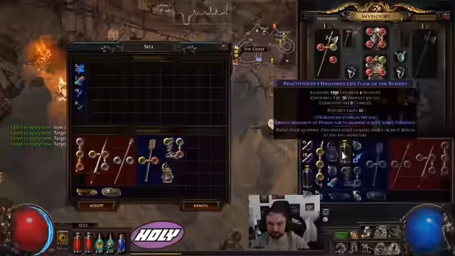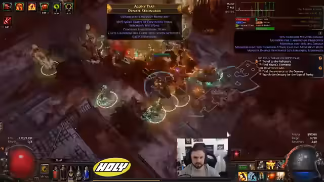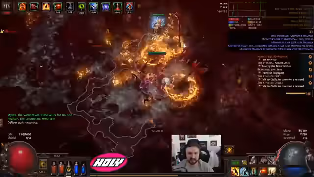 00:08:24Der Streamer beginnt mit den diversen Labortests (Lab Runs) und stellt fest, dass die Bosse, insbesondere Dödre und Pity, extrem gefährlich sind. Er erlebt mehrere Tode, was seine Anspannung steigert. Ein großes Problem ist der hohe Mana-Verbrauch, der seine Manaflaschungen überlastet und ihm zu schaffen macht. Trotzdem verbessert er kontinuierlich die Ausrüstung seines Charakters, um mehr Schaden und Lebenspunkte zu erhalten.