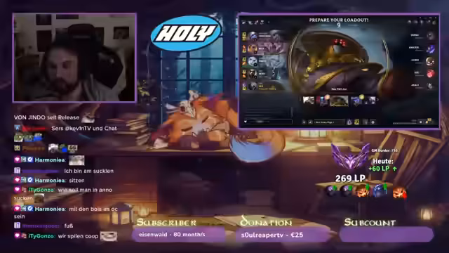 00:00:25Der Stream beginnt mit der Begrüssung des Chat und des Streamers. Er unterhält sich mit Viewern wie 'Ola Tollot' und 'Harmonia', tauscht sich über diverse Alltags- und Gaming-Themen aus. Der Streamer erwähnt seinen 'SoloQ-Abfahrt'-Modus und startet direkt ins erste Spiel, wobei er 'blind picken' darf und das Fehlen eines Healers im Champion-Pool kritisiert. Es folgen lockere Gespräche im Discord, Diskussionen über Animes und Dart-Events sowie die erwähnte Verwendung von 'Skullblacker'.