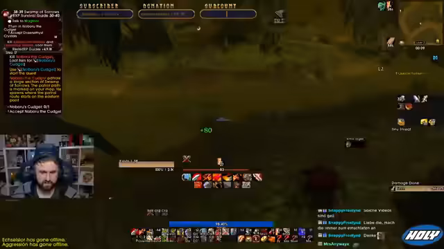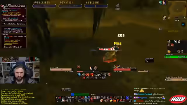 02:23:46Nach einer längeren Wartezeit auf den Spawn eines Mobs, den er verpasst hat, nutzt der Streamer den Instant Hearthstone um sich umzusehen. Er erhält den Birthday Buff von Frosty, der seine Bewegungsgeschwindigkeit um 10% erhöht und erinnert sich daran, dass der Respawn für die Drachen ebenfalls wieder aktiv ist. Er beendet eine Quest, bemerkt aber, dass er diese das letzte Mal vielleicht nicht hatte, und überlegt, ob er sie allein oder mit Gildenmitgliedern, wenn welche online wären, absolvieren soll, wobei er eine Escort-Quest als gefährlich einschätzt.