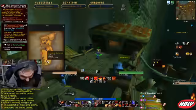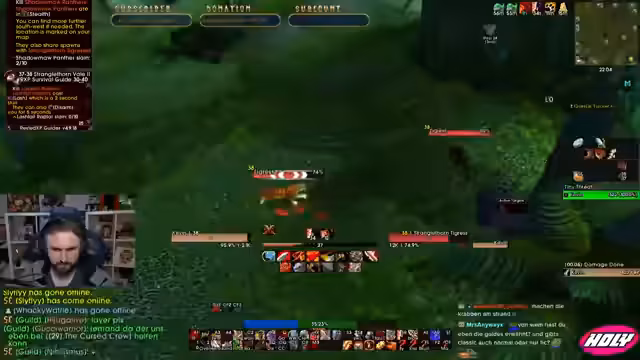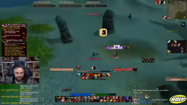02:32:12Beim Farmen in einem neuen Gebiet stellt der Streamer fest, dass die Mobs höher leveln und angreifen, was er markiert. Er vermisst den Stamina-Buff und hofft, noch Seide sammeln zu können. Die Gegend fühlt sich nicht wirklich entspannt an und er ist nicht überleveled. Er bemerkt Patrouillen von Monstern und Rogue-Geiern, die er teilweise unsichtbar folgt. Er stößt auf ein Triple Pack, bei dem er fehlende Fähigkeiten wie Retaliation vermisst und sich über seine fehlenden Kritische Treffer beschwert.
