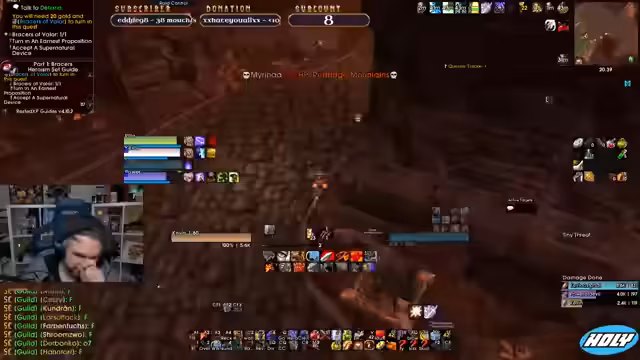 02:38:42Die Gruppe zieht durch den Dungeon, wobei gezielte Gegner wie eine "verwackte Spinne" und ein Rare-Mob, das einen speziellen Umhang droppen kann, das Hauptziel sind. Es kommt zu einem schwierigen Kampf mit einem großen Mobpull, bei dem Kev1ntntv durch unkontrolliertes Aggro-Sammeln in tödliche Gefahr gerät und stirbt. Die Gruppe versucht, die Lage zu kontrollieren und weiterzuziehen.