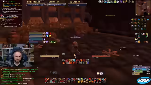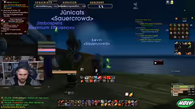 05:21:50Der Streamer plant und koordiniert mit Mitgliedern seiner Community, den "Sauercrowd", zukünftige Aktivitäten. Es geht um einen geplanten Dungeon-Run und um die Farming-Quest "Pille". Er diskutiert mit den Zuschauern über die Ernsthaftigkeit, die man in einem Hardcore-Raid walten lassen muss, besonders wenn man sich mit neuen Spielern befindet. Er reflektiert über die eigenen Fehler und den einen, schicksalhaften Moment, in dem er fast gestorben wäre, und betont, dass das Sterben zum Hardcore-Erlebnis dazugehört. Er schätzt den Spaß, den er trotz des Risikos hat.