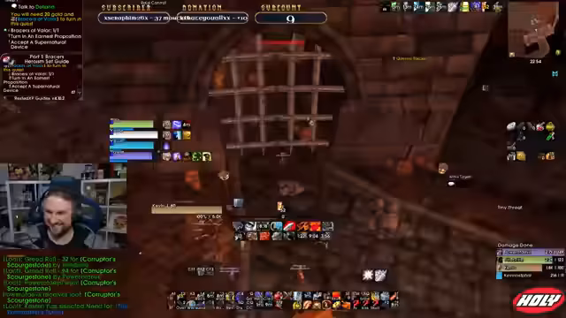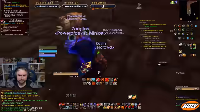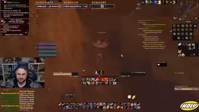 08:04:36Der Streamer fasst den gemeinsam absolvierten Raid zusammen. Die Gruppe habe mit zwei neuen, kleinen Spielern gestartet, was zur Rassismus-Diskussion über Gnome geführt hat. Ein wichtiger Ring mit 5% Dropchance sei bei 25 Runs nur einmal gefallen, was als extrem unglücklich empfunden wird. Das Frust-Level steigt stark an.