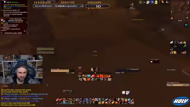 05:47:55Die Gruppe plant einen Dungeon-Run und diskutiert darüber, wie sie einen fünften Spieler in die Gruppe holen können, der für sie das Instanz-Reset durchführen kann. Es gibt eine Debatte über die Eignung von WotLK-Tanks für Endgame-Inhalte, wobei der Streamer sich entschließt, einen Paladin als Tank zu probieren.