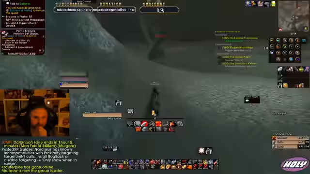 02:01:45Die Gruppe versammelt sich und startet den Raid nach Winterspring. Es kommt zu technischen Problemen, als ein Spieler in ein Loch fällt und sich nicht mehr befreien kann. Nachdem das Problem gelöst ist, kommt es zu einem beinahe tödlichen Unfall, bei dem der Tank fast von einer Klippe stürzt. Der Raid beginnt mit der ersten Gruppe, wobei ein Spieler zur besseren XP-Erzielung auf einem Boot warten muss, während die anderen den Raid starten.