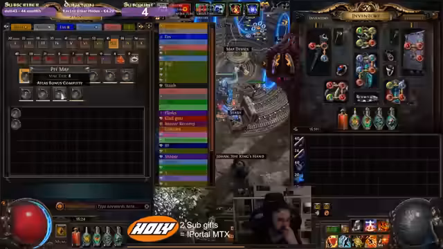 01:23:46Ein Hauptziel ist das Crafting eines Cloak of Flame. Der Streamer muss dafür den Helm färben, was sich als äußerst frustrierend herausstellt, da das Spiel ihn häufig mit blauen statt grünen Farben trollt. Nach zahlreichen Versuchen und viel Chroma-Geld gelingt es ihm schließtlich, den Helm erfolgreich zu färben. Unmittelbar danach gelingt ihm auch das Fusing des Cloaks auf einen 6-Link, was seinen Schaden erheblich steigert und ihn zu einem großen Erfolg im Stream wird.
