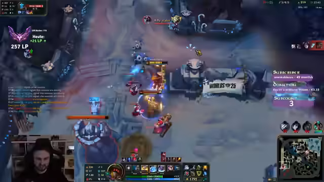 02:01:24Der Streamer bemerkt, dass Stunners Botlane ist und er schnell weg muss. Er plant, Sterax in Randuin's zu bauen und die Wave zu pushen, um für Akschan zu resetten. Er ist verwirrt über die Ereignisse im Spiel, da sie Midlane-Turret, Botlane-Turret und Kills verlieren. Er bedauert, dass er gestorben ist, da er sonst eventuell hätte helfen können. Er beklagt, dass das Team kämpfen wollte, obwohl sie keine Ults hatten. Er spricht über einen 'nervigen Bart' und plant, Randuins als nächstes Item zu kaufen, da es gegen Triple Crit 'huge' ist. Er muss die ganze Zeit jede Sideline machen. Er bedankt sich für die 'wunderschönen Worte' und plant, Base zu gehen, um Boots und ein Upgrade zu kaufen. Er ist überrascht, dass er den Teamfight überlebt hat und fragt sich, was die Gegner noch pushen wollen. Er plant, Randuins nach den Golems zu haben und sein Dorans zu verkaufen. Er ist verwirrt über die Aktionen seines Lucians.