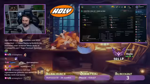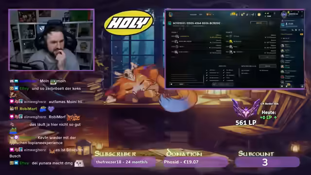 00:00:03Der Stream beginnt mit dem Ausspruch "Und jetzt kommt ein Top hin." Der Kommentator stellt das Team vor, das Zyra und Diana in der Mid-Lane spielen wird. Er berichtet über die jüngste Erfahrung mit der neuen Prestige-Skin von Kaisa und erwähnt ein erfolgreiches Game gegen den letzten Platz, das mit einer Kaisa und Nami-Kombination funktionierte. Er skizziert die grundlegende Spielstrategie, die darin besteht, zuerst die Mitte zu kontrollieren und dann Druck auf der Top-Lane aufzubauen.