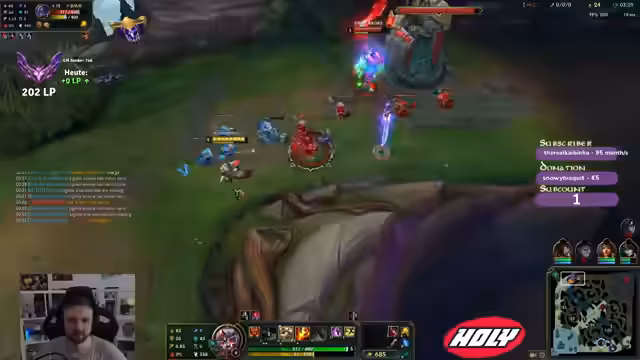 00:17:28Ein spezifisches Spiel wird live analysiert. Der Streamer kommentiert taktische Manöver wie 'Trifor schnell ab' und ein erfolgreiches 'Double Kill'. Er diskutiert die Positionierung von Teammitgliedern, 比如 'hier oben', und erkundigt sich nach dem Aufenthaltsort eines Gegners. Auch der Aufbau von Items wie 'Titanic' wird thematisiert.