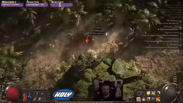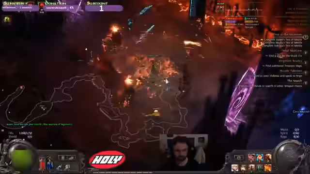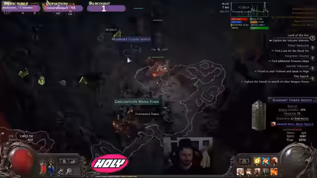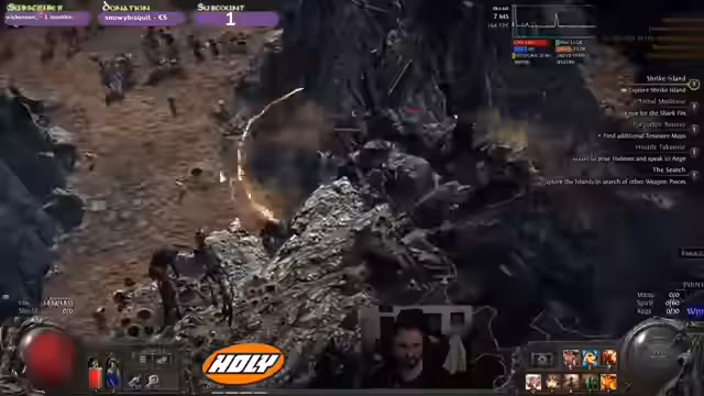 00:27:31Ein Abgrund sorgt für einen Schreckmoment, da der Streamer befürchtet, erneut zu sterben. Es wird überlegt, ob ein Ausgang aus dem Abgrund möglich gewesen wäre. Der Streamer benötigt neue Schuhe mit mehr Movement Speed und entdeckt einen Chaos Ring. Es wird überlegt, diesen zu verändern, aber der Loot ist schlecht. Der Schmied wird aufgesucht, aber hat nichts Passendes. Es wird festgestellt, dass bereits gutes Gear vorhanden ist, aber noch Verbesserungen für Schilde und Handschuhe benötigt werden. Ein Bosskampf wird erfolgreich bestritten und die Frage aufgeworfen, ob Giants Blood gespielt werden soll. Dies wird jedoch verworfen, da eine schnelle Waffe für Earthquakes bevorzugt wird. Der Streamer merkt an, Fortifying Cry öfter nutzen zu müssen und überlegt, welche Support Gems verwendet werden sollen. Es wird ein Hideout ausgewählt und zur nächsten Map gesegelt.