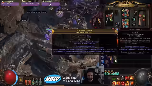 01:14:53Die finale Phase konzentriert sich intensiv auf das 'Crafting'. Der Streamer hat große Mengen an Ressourcen gesammelt, leidet aber unter vollem Inventar. Es werden verschiedene Gegenstände auf ihre Tauglichkeit für 'Crafts' untersucht und Modifikationen wie 'T1 Physical' und 'Attack Speed' analysiert. Das Management von 'Divines' als wichtige Crafting-Währung wird ebenfalls angesprochen. Abschließend wird eine neue 'Six Link'-Brustplatte als Upgrade präsentiert, das den Build weiter verstärkt.