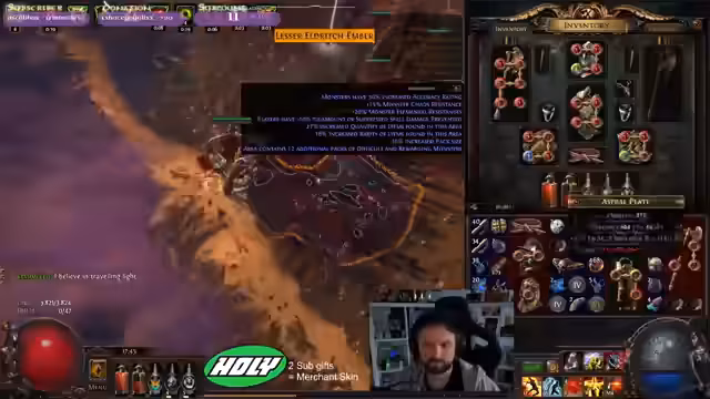 10:12:22Ein Großteil des Streams ist dem Crafting und der Verbesserung des Equipments gewidmet. Der Streamer nutzt Exaltierte Orbs und Chaos-Orbs, um wertvolle Modifikationen auf Items zu schlagen, um seine Widerstände, Leben und den Schaden zu verbessern. Besonders das Craften von Chaos-Resistenz durch Umwandlung anderer Widerstände ist ein wiederkehrendes Thema. Er zeigt ein erfolgreiches Crafting eines Helms, das ihn in puncto Widerstände und Leben stark weiterbringt.