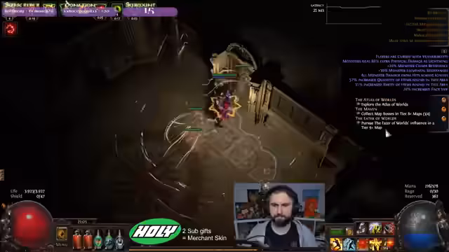 02:19:53Der Streamer wechselt zum Farmen von Karten (Maps) im Atlas-System. Er bespricht Strategien für die Kartennotizen (Map Notes), um den Sustain zu verbessern, und erkundet verschiedene Karten-Mechaniken wie 'Breach' und 'Ambush'. Es werden regelmäßig gecraftete Items vorgestellt und die Map-Loot-Boni diskutiert, wobei er versucht, seine Atlas-Progression effizient voranzutreiben.