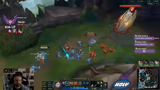 00:06:13Das Spiel verläuft unvorhersehbar und der Streamer ist von derITEM-Build-Analyse begeistert. Er stellt fest, dass Dorans Blade spät im Spiel wenig Nutzen stiftet und betont die enorme Schadensdifferenz. Trotzdem verpasst er den Focus auf den Cannon-Minion und bemerkt, dass er durch diese Entscheidung Gold und Druck im Spiel verloren hat.