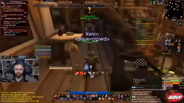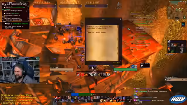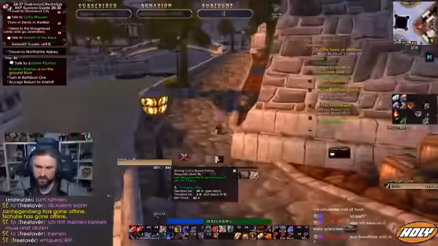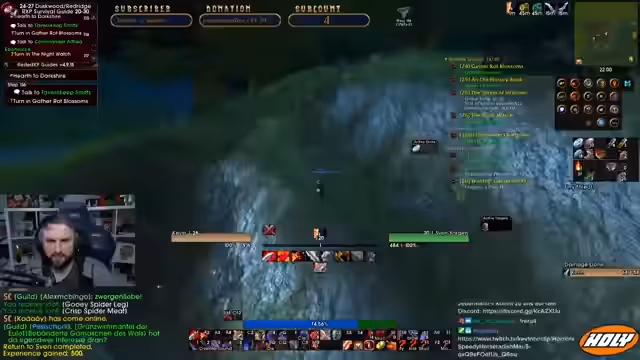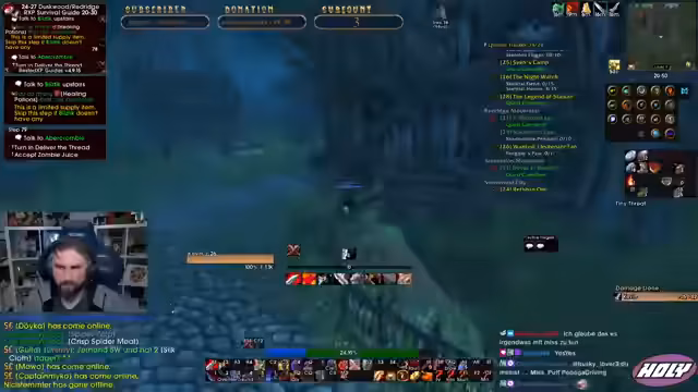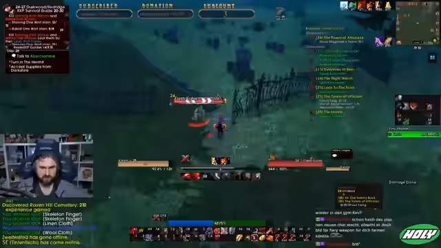 07:45:36Nach einigen Solo-Quests und Toden plant der Streamer einen Run durch den Deadmines Dungeon. Er sucht nach einer Gruppe, da er allein niemanden in seiner Level-Range findet. Er fragt im Stream nach, wie BRD Runs bei anderen Streamern ablaufen, um ein besseres Verständnis für die typische Vorgehensweise zu bekommen. Er ist neugierig, ob sie Full-Runs machen oder nur bestimmte Teile absolvieren.