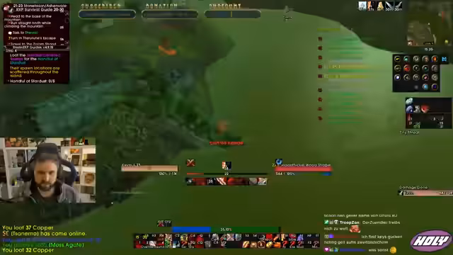 09:48:54Der Streamer hat seinen Warrior auf Level 23 gebracht und plant, ihn wegen des Tankmangels in der Gilde wieder als Tank zu leveln. Er berichtet, dass er einen auf 60 leveln will, bevor er mit TBC beginnt, da die effizienteste Methode darin besteht, zuerst einen Hauptcharakter auf das Maximum zu bringen. Er erwähnt auch, dass er seinen Level 54 Warrior und Level 39 Hunter aufgegeben hat, um sich auf diesen Warrior zu konzentrieren, und dass das Leveln mit Dagger sehr Spaß macht und konstanten Schaden verursacht.