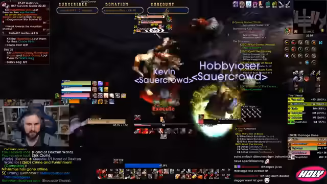 02:28:20Wichtige World Buffs stehen kurz bevor, was die Priorität für die nächsten Aktionen bestimmt. Der Streamer sucht nach einem speziellen Boss, der den gewünschten Dagger droppt, und hofft, diesen schnell farmen zu können. Parallel wird der Weg nach Silvermoon und der Story-Hintergrund, wie das Beschützen des Sunwell, erwähnt und eine Trennung zwischen PvP, Questing und Loot-Farming deutlich.