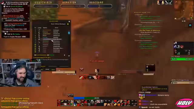 09:05:00Der Streamer spricht über einen erfolgreichen Raid, den er als Raid-Lead geleitet hat, bei dem sie eineinhalb Stunden brauchten. Er erwähnt, dass sie auch einige 60er verloren haben, darunter Juli Mii und Flesk. Dies war der Grund, warum er seinen Hunter rerollte und wieder einen Krieger spielte. Er ist stolz darauf, Teil eines neuen, tryout-Gildenmitglieds zu sein, das alles für die Gilde gibt und mit dem er dieses Jahr auf LAN fahren wird.