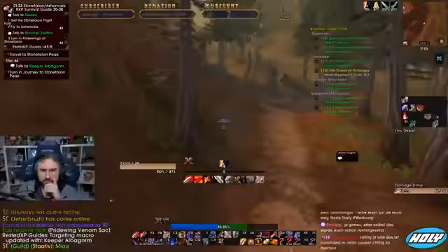 06:48:04Der Streamer diskutiert mit seiner Gruppe über die weiteren Pläne und mögliche Gruppenzusammenstellungen. Er vermisst die World Buffs, die ihm im Spiel einen deutlichen Vorteil gegeben haben. Sein Ziel ist es, einen Old History Book zu finden. Nachdem er einige Gegner mit Hilfe von Pots und Schleifsteinen besiegt hat, findet er das Buch und ist begeistert. Es kommt zu einem Ansturm auf die Ressourcen in der Gegend, da mehrere Spieler gleichzeitig questen und looten wollen.