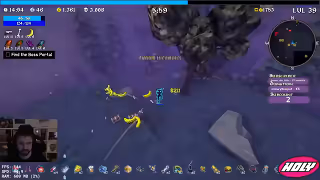 00:58:09Die aktuelle Konzentration liegt auf dem Farmen von Gold und Erfahrungspunkten. Der Streamer erkundet verschiedene Gebiete, darunter Wüste und Forest, um Truhen und wertvolle Items zu finden. Er stößt jedoch auf Hindernisse wie 'Swarm'-Phasen, in denen er sich überfordert fühlt. Gleichzeitig testet er neue Waffen wie 'Boomies' und 'Slutty Rockets', um deren Effektivität in der Runde zu bewerten und seine Damage-Zahl zu maximieren.