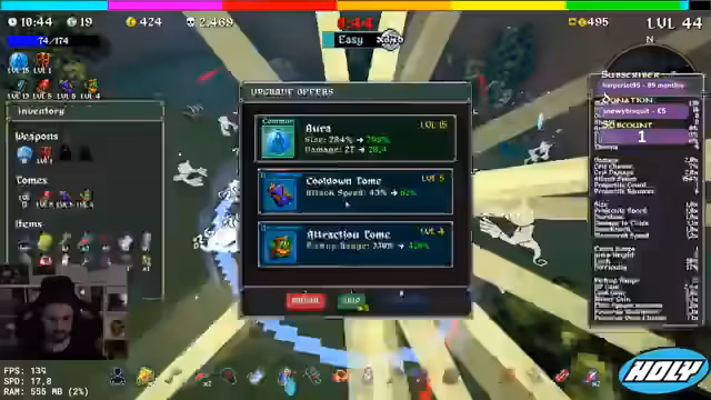00:10:03Nachdem der Streamer anfangs Schwierigkeiten hatte, steigt er nun kontinuierlich im Level auf. Er trifft auf Bosse und versucht, diese mit seiner wachsenden Stärke zu besiegen. Er entdeckt eine Nuke-Waffe, die ihm im Kampf hilft, und stellt fest, dass die automatische Techniküberschreitung ein starkes Tool darstellt. Gleichzeitig ist er besorgt über fehlende Regeneration und überlegt, die Schwierigkeit zu erhöhen, um mehr Schaden zu erhalten, was jedoch auch Risiken birgt.