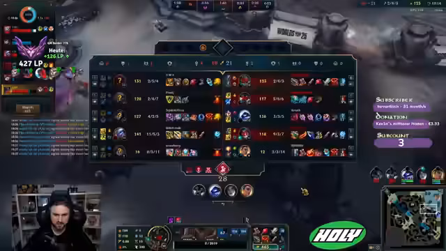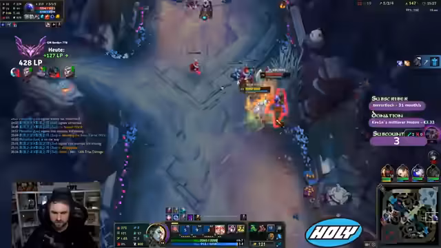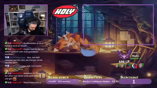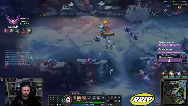 00:30:40Der Streamer äußert Bedenken wegen fehlendem Teleport und der Möglichkeit, auf der falschen Seite der Karte zu landen. Er ist weiterhin beeindruckt von der Effizienz von Halo Blades und der schnellen AD-Skalierung. Es kommt zu einer unklaren Situation am Nashor, bei der er sich fragt, warum das gegnerische Team nicht reagiert. Die Winrate von Sahin wird mit 54,5% erwähnt, was auf eine gute Performance hindeutet. Später bemerkt der Streamer, dass das Holy-Logo im Stream fehlt, was er korrigiert. Er spielt ein weiteres Game und überlegt, ob er das Spiel noch einmal spielen sollte, da er seine alten Account-Daten für GW1/GW2 nicht mehr findet. Er erinnert sich an seine alten Spielernamen wie 'Robot Z Swordmaster' und muss seine Login-Daten für Guild Wars 2 wiederherstellen.