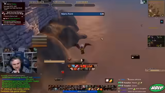 00:01:49Nachdem die World Buffs aktiviert wurden, startet der Streamer eine Farm-Session in Höhlen in Felwood und Burning Steps. Mit den Buffs geht das Leveling zügig vonstatten, was sich auf die XP pro Stunde auswirkt. Eine besondere Herausforderung ist eine Quest, die den Status 'Unfriendly Neutral' erfordert. Durch eine Fehlannahme der Quest wird der Fortschritt unterbrochen, und der Streamer muss seine neutraler Status erst wiederherstellen. Dabei entstehen einige Verwirrungen und verzögern das Vorankommen.