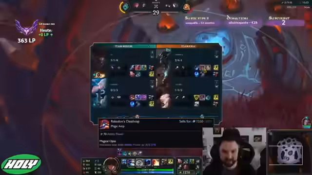 01:33:15Das Team steht nun vor der Herausforderung, Kassadin und Morgana zu bekämpfen. Der Streamer betont die Schwierigkeit, Morgana nicht engagen zu können, und plant stattdessen, sie mit seiner Ultimation zu konfrontieren. Die Komplexe Synergien der Gegner werden analysiert. Der Streamer erhält erneut seine Ultimation und ein sehr starkes neues Item, das ihm erlaubt, ein Ziel mit geringster Gesundheit anzugreifen und danach seine Ultimation sofort neu zu laden, was für die Combo entscheidend ist.
