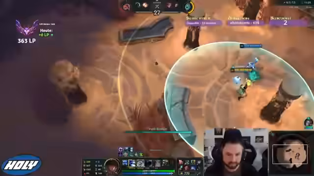 01:22:11Der Streamer wechselt die Perspektive auf seine Mitspieler, Lux und Udyr, die gegen Tap Dancer und Eureka antreten, während er selbst auf seine Verstärker konzentriert ist. Es gibt Koordination im Team, bei der der Streamer nach einem speziellen Item fragt, Twinmask, um seinen Schaden zu erhöhen. Der Kampf gegen ein gegnerisches Corki- und Leona-Duo verlangt nach strategischem Vorgehen, um den Corki zu eliminieren, während die Leona sich mit Courage of the Colossus aufbaut. Tomaten als Hilfsmittel werden wieder ins Spiel gebracht.