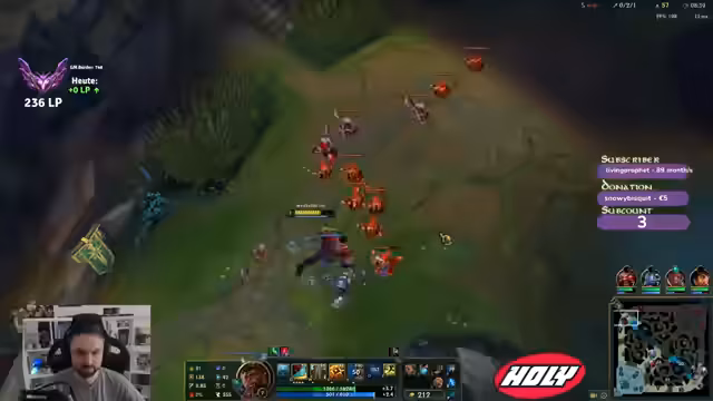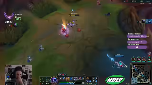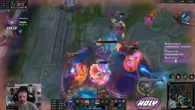 00:07:36Der Streamer startet ein League of Legends-Spiel. Er analysiert die gegnerische Teamkompensation, insbesondere den Fokus auf einen Bramble-Vest-Build gegen seinen Champion, und äußert seine Sorgen über ein als schmerzhaft empfundenes Matchup. Im Laufe des Spiels kommentiert er seine Spielzüge, darunter ein gescheitertes Recall-Manöver und einen erfolgreichen Kampf, in dem er den Kill gegen einen gegnerischen Jungler sichert. Er kritisiert auch die Teamkommunikation und das Verhalten von Mitspielern, als ein Teamkollege stirbt und die Situation für das Team schwieriger wird.