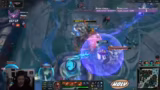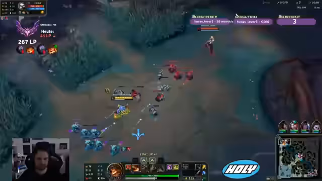 03:22:06Die Kommunikation im Team wirkt überfordert und unkoordiniert. Fehler wie das falsche Drücken der Combo-Tasten führen dazu, dass wichtige Fähigkeiten 'falsch herum gedrückt' werden. Trotzdem gelingt ein erfreulicher Triple-Ulti-Kombo-Einsatz, als der Streamer seine ulti auf dem gegnerischen Nami platziert. Ein späterer Teamfight endet jedoch chaotisch, da eine fehlgeschlagene Flankierungsstrategie und der Verlust der wichtigen 'Fidder'-Fähigkeit zum Scheitern führen. Der Spieler ist sich der eigenen Fehler bewusst und kritisiert die daraus resultierenden Todesfälle.
