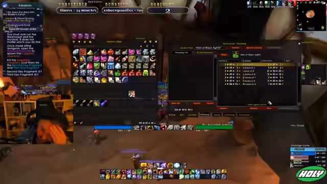 01:06:48Die Vorbereitungen für den geplanten Raid in Karazhan laufen auf Hochtouren. Es wird über die benötigte Ausrüstung für die Tanks gesprochen und ein Tank mit einem speziellen Schild gesucht. Der Streamer kauft bereits Rüstungssets und bereitet Tränke und Elixire vor, wobei er überlegt, ob Flask oder Kampferelixire die bessere Wahl für den Heiler sind. Auch die Arena startet bald und der Streamer hofft auf gute Drops aus den Arenen, um sein Gear weiter zu verbessern.