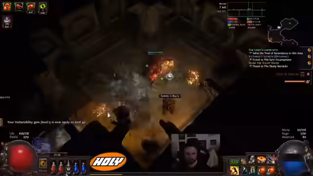 00:02:55Während des Streams werden verschiedene Anpassungen am Build vorgenommen. Da der Streamer anfangs seine Flaschen nicht richtig einsetzt und Mana-Probleme hat, entscheidet er sich für einen Fokus auf Momentum. Er plant, Shield Charge als primäre Bewegungsfähigkeit zu nutzen und stellt seine Ausrüstung schrittweise um. Es wird ein neuer, stärkerer Schild gesucht und es wird über die Verwendung von Holy Flame Totem oder Decoy Totem für mehr Überlebensfähigkeit diskutiert. Wichtig ist es für ihn, seine Resistenz gegen Kälte, Feuer und Blitzschaden zu maximieren und Cap zu erreichen.