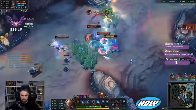 00:17:27Der Streamer plant, nach dem Basen zum Drachen zu gehen und überlegt, ob er 'Black Cleaver' kaufen soll. Er stellt fest, dass alle Gegner 'ziemlich hart' sind und er 'gnadenlos auf die Fresse' von Kiana bekommt. Er hat Angst, 'face checken' zu müssen, da Kiana 'sneaky' ist. Er bemerkt, dass seine Teamkollegen noch keine zwei Items fertig haben, während der Gegner Kaiser bereits zwei Items besitzt. Er ist überrascht, dass Kianas Ult ein 'Tank-Counter' ist und 'prozentualen Damage' verursacht. Er beschreibt einen Kampf als 'sexy Fight' für sich und überlegt, ob er die Toplane 'rauspushen' soll, um 'snowballen' zu können. Er ist unsicher bezüglich der Teamfights, da die Gegner sie 'one-shotten' und der eigene Ivern 'Turbo-Useless' sei. Er sieht einen dummen Fehler der Gegner und gibt der Aurora 'Backup'. Er überlegt, ob er für 'Guardian Angel' gehen soll, ist sich aber unsicher. Er muss 'Frontline spielen' und den Drachen aufgeben. Er ist überrascht, wie er einen Kampf überlebt hat und plant, 'Death's Dance' zu kaufen. Er überlegt, ob es besser wäre, mit 'Lauf und Aurora Split' zu spielen.