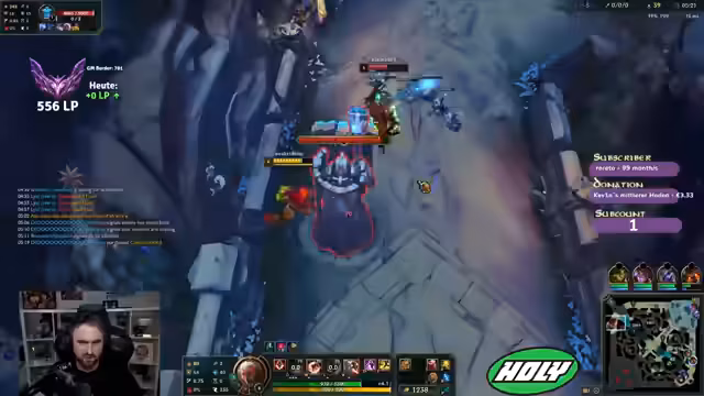 00:37:33Der Streamer stellt fest, dass er '5000 Damage mehr' hat und überlegt, welches Item er als Nächstes kaufen soll, möglicherweise 'Jay'. Er glaubt, dass 'Jay' die Lösung sein könnte, um 'rookern' zu können. Er bemerkt, dass der 'Lordius' viel weggesaugt hat und dass das Spiel vorbei wäre, wenn die 'Kaisersonyas' gehen würden. Er beschreibt die Situation als 'Alarm', wenn man in den Gegner rennt, und ist frustriert über das passive Spiel seines Teams. Er beklagt, dass sie 'drei Flashes ab' haben, aber niemand etwas unternimmt und sie zusehen, wie die Gegner sie 'runterlaufen'. Er entscheidet sich für 'Zac' als Champion und hofft, dass er nicht 'weggepickt' wird. Er bemerkt, dass Koreaner keine großen 'Trinity-Fans' sind und stattdessen 'Stridebreaker' bauen. Er ist müde und hatte nicht viel Schlaf. Er ist sauer auf die LVM-Versicherung, die ihm ein teures Angebot gemacht hat. Er spielt gegen einen Warwick-Top, den er als 'Hard-Counter' empfindet, und versucht, ihn zu zonieren. Er überlegt, 'Stridebreaker' wieder zu probieren, ist sich aber unsicher, ob es sich gut anfühlt.