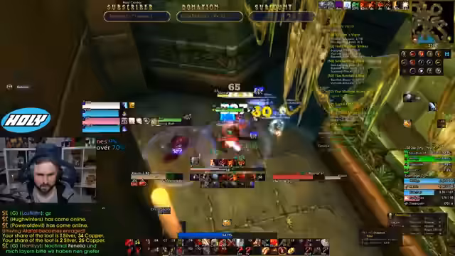 01:01:38Endlich beginnt der lange geplante Run durch den Tempel von Atal'Hakkar. Nach einigen technischen Schwierigkeiten und Koordinationsproblemen gelingt es der Gruppe, den Dungeon zu betreten. Der Streamer erklärt den Weg und die erste Schlüsselquest für den Zugang zum Käfig eines Bosses. Die Atmosphäre ist angespannt, da der Streamer mehrfach betont, wie anspruchsvoll der Dungeon und insbesondere der Endboss Hakkars Avatar sein wird. Die Gruppe kämpft sich durch die ersten Gegner und muss sich auf große Pulls vorbereiten.