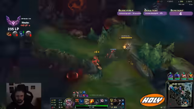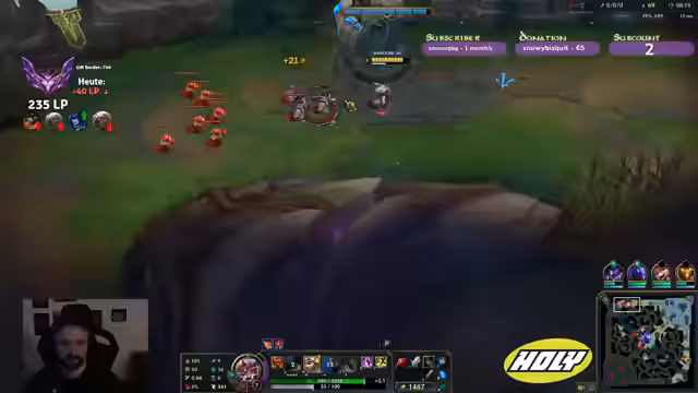 00:09:34Der Streamer kommentiert den Start des Spiels, der holprig verlief und mehrmals unterbrochen werden musste, bevor er Fahrt aufnahm. Er analysiert eine Spielsituation, in der er einen Gegner falsch angriff, aber dessen fehlende Fähigkeiten ausnutzen konnte. Es wird die Hassliebe zum Tower thematisiert und die Bedeutung der Kombination aus Boneplating und Unflinching hervorgehoben. Der Streamer überlegt, Honeyfruit zu holen, um mehr Sustain zu haben, und kommentiert den CS-Rückstand. Er bemerkt, dass er aufgrund des vielen Redens Husten bekommt. Es wird kurz über einen anderen Spieler namens Falke und dessen Spielweise gesprochen. Der Streamer stellt fest, dass er trotz eines leichten Goldvorteils von nur 500 Gold und 20 CS knapp vorne liegt. Er entkommt knapp einer Situation im Gebüsch.