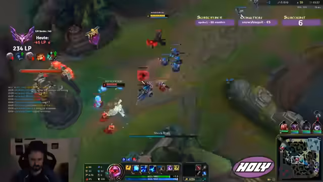 00:10:56Ein herausforderndes Duell gegen einen Renekton beschäftigt den Streamer. Nach einem langsamen Start gewinnt er an Fahrt und nutzt den Vorteil, um den Gegner zu überlisten. Er sichert sich ein gutes CS-Verhältnis und plant seine Item-Builds strategisch, wie z.B. den Kauf von Honeyfruit oder Randuin's Omen. Die Farm-Session verläuft erfolgreich, doch der Gegner bleibt eine ständige Bedrohung und holt sich durch gutes Timing einen Vorteil.