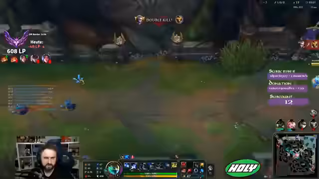 00:04:39Das Gameplay im League of Legends SoloQ beginnt mit intensiven Teamkämpfen und strategischen Entscheidungen. Der Streamer spielt verschiedene Champions wie Gnar und Poppy. Er analysiert seine Leistung und die seines Teams, wobei er sowohl Erfolge als auch Fehler kritisch betrachtet. Besonders hervorgehoben wird ein 1-gegen-2 Kill, den er als beeindruckend betrachtet, und seine Strategie bei Teamfights.