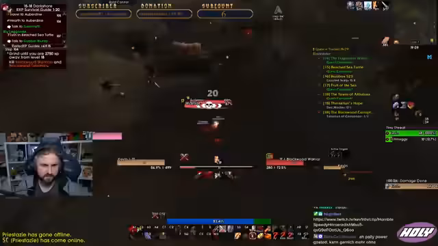 01:53:20Bei der Quest in Darkshore stößt der Streamer auf technische Probleme mit einem interaktiven Objekt. Er muss mehrmals versuchen, eine bestimmte Kiste zu looten, was einige Zeit in Anspruch nimmt. Gleichzeitig kommt es zu einem PvP-Zwischenfall, in dem er von einem Rogue angegriffen wird, dem er aber entkommen kann. Er äußert seine Frustration über die Performance des Warriors im Vergleich zu anderen Klassen.
