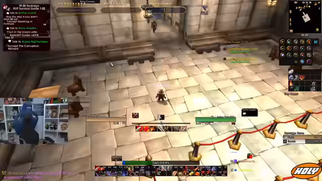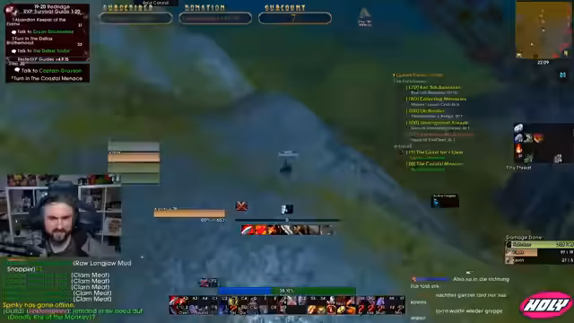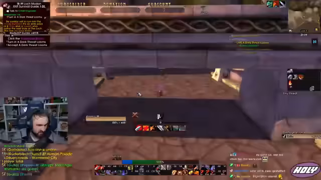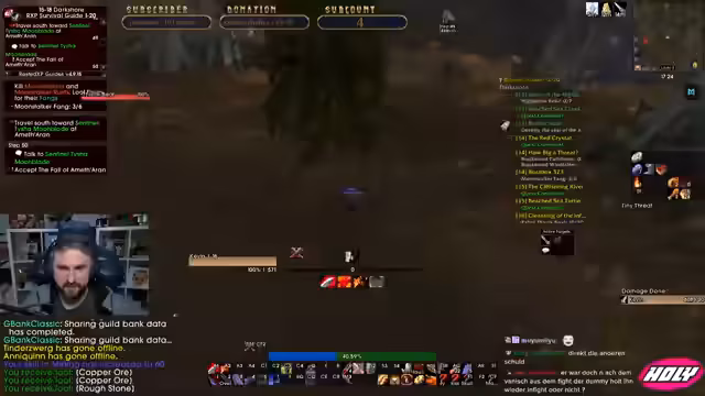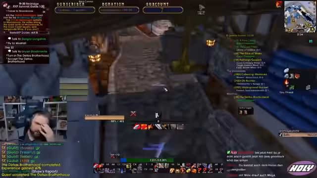 07:38:46Der Streamer überprüft seine Buffs und stellt fest, dass er die Splitterbruder-Trophäe nicht im Inventar hat, was er als verpasste Gelegenheit ansieht. Im Dungeon selbst wird versucht, eine Taktik mit Damage Stop zu entwickeln, um den Boss Van Cleef zu stunden. Es kommt zu Problemen mit der Aggro-Verteilung, da mehrere Tanks in der Gruppe sind, was zu Verwirrung und chaotischen Situationen führt. Die Notwendigkeit von klaren Rollen und Kommunikation wird erneut betont.