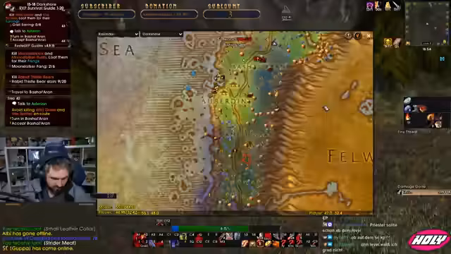 00:28:40Während des Levelings im Gebiet von Darkshore stößt der Streamer auf Herausforderungen mit der aktuellen Ausrüstung. Er ist mit einem Schild und einem Dolger bewaffnet, merkt aber, dass der Schaden niedrig ist und er ein besseres Schild benötigt. Die Gildenbank, bei der er sich üblicherweise mit Items versorgt, ist heute jedoch offline. Er erkundet alternative Wege für Loot und kontinuierliches Leveling, während er auch für PvP-Vorteile als Gnome wirbt.