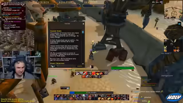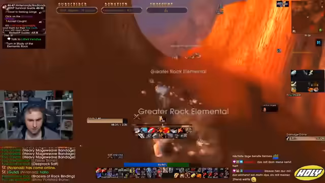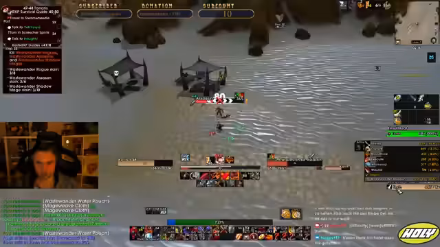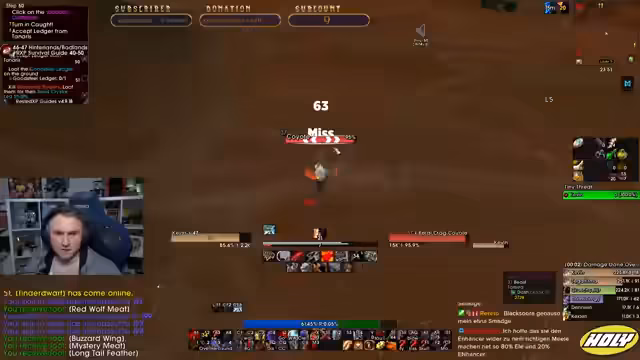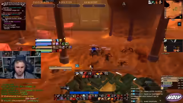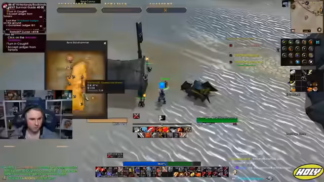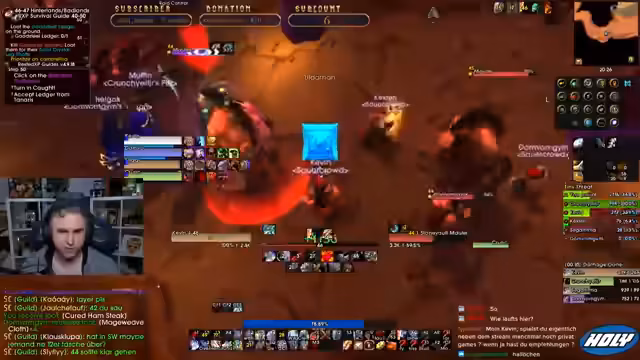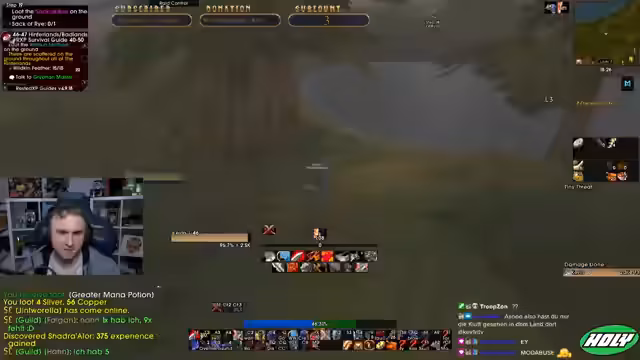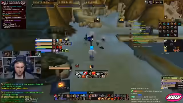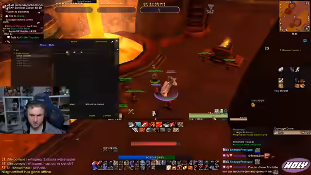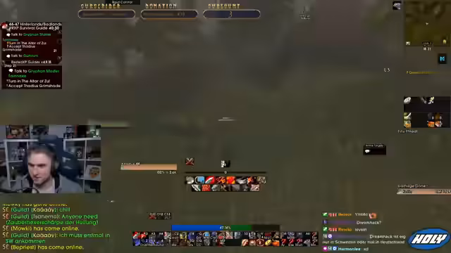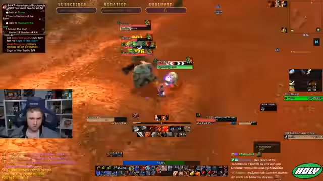 05:01:56Der Stream neigt sich dem Ende zu. Die Gruppe beendet ihre Aktivitäten, spricht über zukünftige Pläne wie TBC und gibt sich gegenseitige Tipps. Die letzten Aktionen bestehen aus dem Abgeben von Quests in Iron Forge und einem kurzen Austausch über bevorstehende Herausforderungen im Spiel. Der Stream endet mit der Verabschiedung der Zuschauer.
