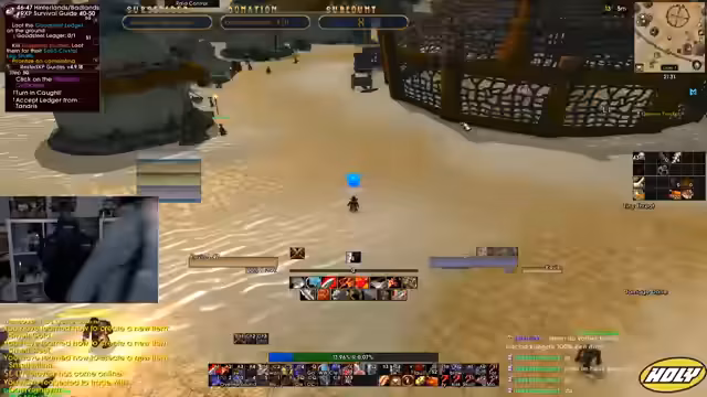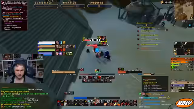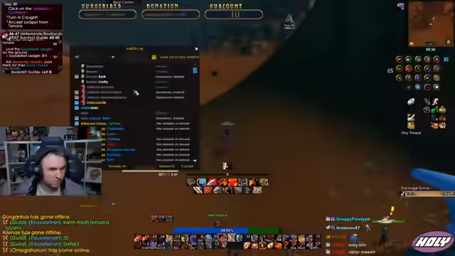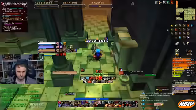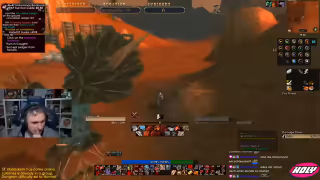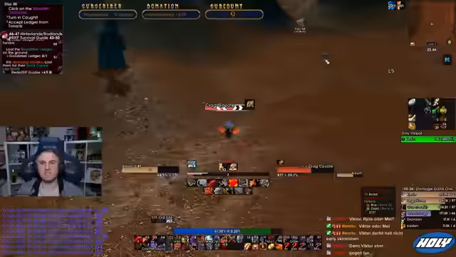 04:05:10Der Stream beginnt mit technischen Problemen, da die Addons hängen und neu geladen werden müssen. Anschließend betritt die Gruppe einen Dungeon, wobei der Streamer den Einsatz des Void-Blockers für die Ads-Aufmerksamkeit vorschlägt. Es folgen Diskussionen über die Rollenverteilung, ein gestorbener Boss und die Annahme von Quests, wobei ein Fehler bei der Übergabe eines Gegenstandes festgestellt wird.