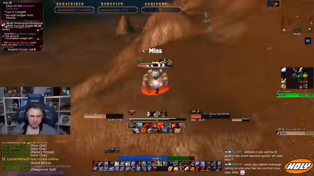 00:10:50Nach der Diskussion über Dungeons konzentriert sich der Stream auf den Grind in Tanaris. Es wird das Problem angesprochen, dass Mithril-Erz sehr selten ist und fehlt, um den Bergbau-Bereich vollständig zu nutzen. Der Streamer versucht, die fehlenden Erze durch das Abschließen von Quests zu kompensieren, was jedoch Zeit kostet. Auch das Farmen von Federn für eine Quest wird erwähnt, was zu einer frustrierenden und zeitaufwändigen Suche nach Ressourcen wird.