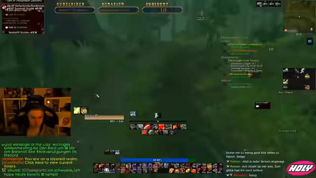 05:30:43Der Streamer gibt Gameplay-Tipps für seinen Warrior. Er erklärt die Bedeutung von Makros für Taunts und Battle Stances und vergleicht verschiedene Ausrüstungsstats wie Stärke, Ausdauer und Rüstung. Während eines laufenden Dungeons wird über einen Platten-Armor-Disput diskutiert. Er erzählt von seinem Level-Fortschritt und seinem Plan, bis Level 49 zu questen, um einen Fullrun im Dungeon zu machen. Die Gruppe muss einen gefährlichen Pull auf der Treppe meistern und die Koordination verbessern.